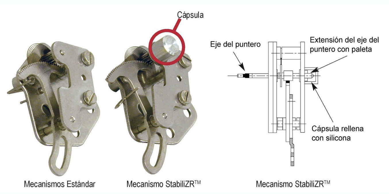Los manómetros con sistema StabiliZR® adoptan un enfoque novedoso en el diseño de los medidores. En primer lugar, se aplica una silicona de amortiguación directamente al movimiento del puntero, en lugar de toda la caja, lo que reduce significativamente la cantidad requerida y el peso resultante. En segundo lugar, la silicona se encuentra en una cámara sellada, lo que evita su evaporación y mantiene la lubricación en el movimiento del puntero durante toda la vida útil del medidor.